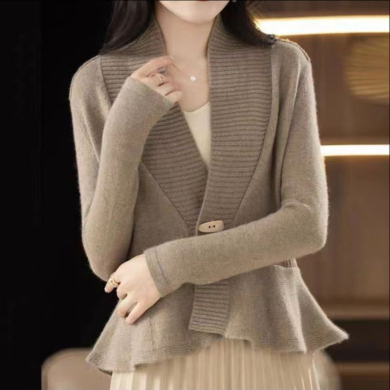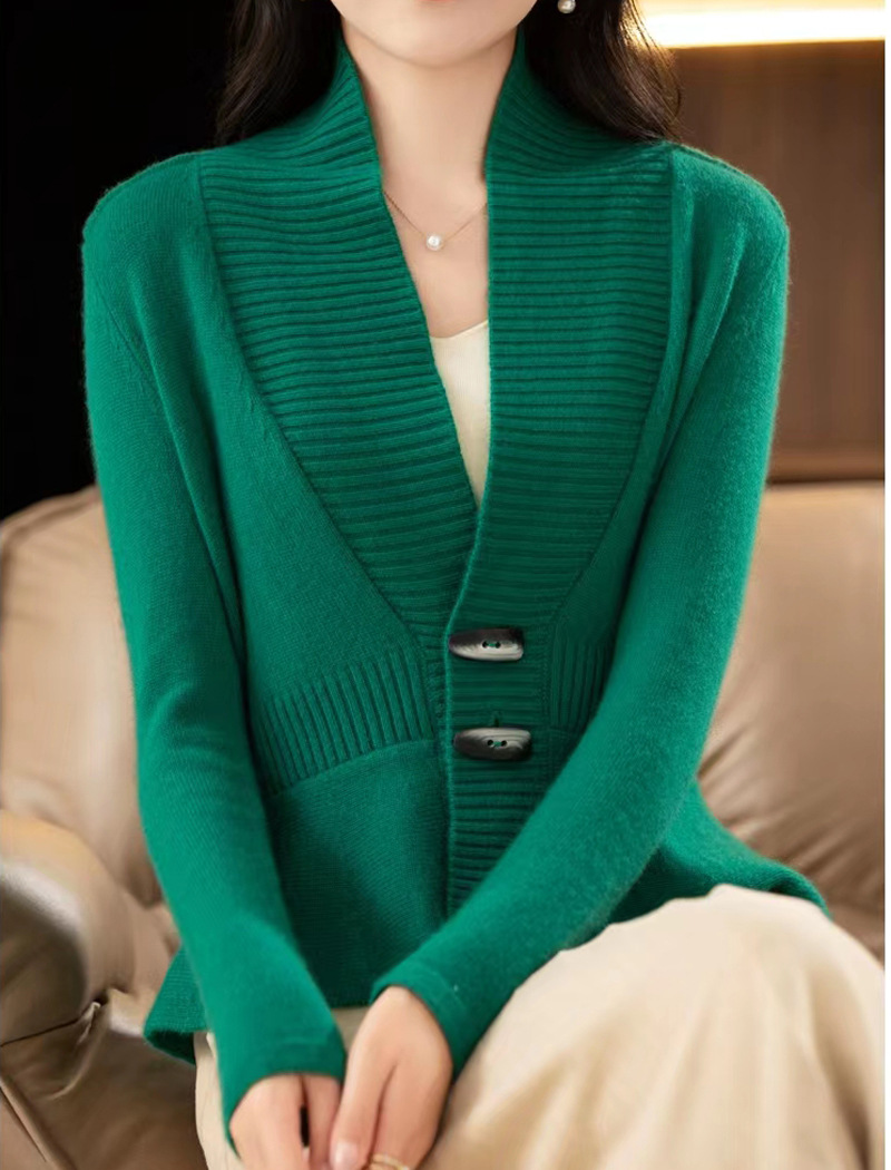 Knitted cardigan for women in autumn and winter V-neck horn buckle waist-hugging two-pin button lotus leaf sweater for women
